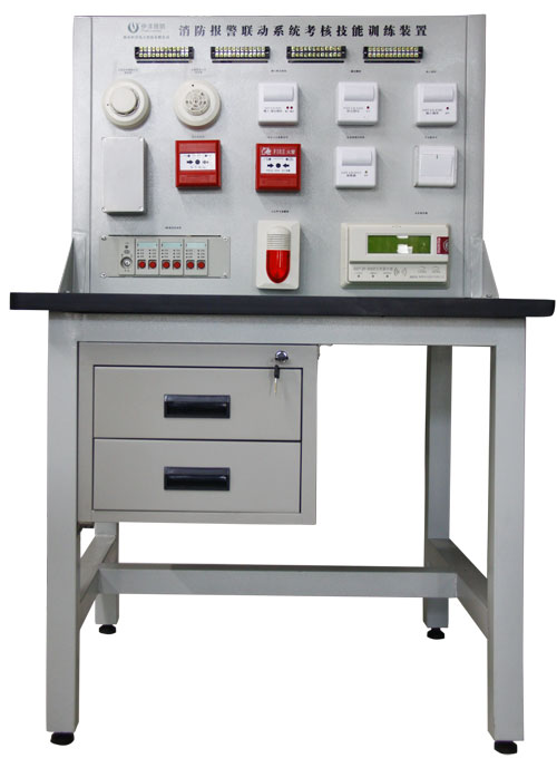實物訓練標準裝置主要由點型光電感煙火災探測器、點型感溫火災探測器、火災探測器通用底座、手動火災報警按鈕、消火栓按鈕、輸入模塊、輸出模塊、輸入/輸出模塊、隔離器、固定式消防電話分機、消防電話插孔接口、消防電話分機、火災聲光報警器、火災報警控制器(聯動型)、總線制操作盤、終端器、直接控制盤、智能電源盤、火災顯示器、消防廣播分配盤、消防電話總機、廣播功率放大器、消防廣播、直流24伏轉換繼電器、自鎖型信號按鈕、消防應急燈、消防應急標志燈、非消防電源切斷模擬裝置、消防泵模擬裝置、噴淋泵模擬裝置、消防電梯模擬裝置、防火卷簾門模擬裝置、排煙風機模擬裝置、正壓送風機模擬裝置、正壓送風閥模擬裝置、排煙防火閥模擬裝置、時間繼電器、蓄電池、設備機柜、配線線路等各種分立設備及元器件組成,除消防聯動模擬裝置外,其它部件均為工程現場安裝的實際設備,最大限度的接近工程現場工況,為廣大學員畢業后迅速融入實際,打下了堅實基礎。